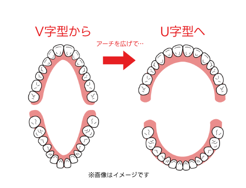 ② 通常よりも狭V字型に変形している歯列弓の拡大(下図イメージ参照)